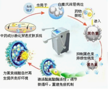 经雾化药物纯度高,呈微粒状态,并含多种微量元素,易于吸收,药效可直接渗透于细胞之中,多种功效有机结合,靶向治疗,深度修复,从而刺激黑素细胞的增殖和移行,激活酪氨酸酶的活性,加速酪氨酸的氧化和聚合,从而促使黑色素合成增加。中药药物活性能激活修复黑色素细胞获取营养的供应通道,使黑色素细胞正常营养供应,以其极强的穿透性、亲和性和抑制性快速激活功能低下的黑色素细胞,促使黑色素细胞成活以及增殖,形成自主色素区,最后定居在表皮的基底层,形成黑素细胞储库,持久保持皮肤的正常肤色。