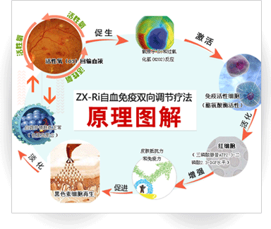 中德.蓝氧靶向血液祛白疗法将经特殊处理的活性氧融入血液,使其渗透入皮肤内毛细血管,并迅速分解为氧分子和氧原子,通过刺激神经感受器通过神经系统反射影响整个机体,产生反射性作用。氧分子迅速渗透到白斑病灶区域,参与机体新陈代谢,稳定并提高血液中自由基性能。自体血液中的自由基通过与O3中的氧离子充分结合,有效调节人体微循环,修复受损皮肤黑色细胞,激活黑素细胞正常分裂与复制,促进黑素细胞新陈代谢功能,有效加快改善微循环,激活免疫细胞、活化酪氨酸酶、提高血液自由基的功能,同时提高人体调节免疫机制,对病灶区域进行深层调理,使黑素细胞自然再生。
