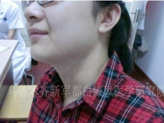 ▲病史:王梦2012年年初就发现下颚部有一块小白斑,当时王梦以为只是简单的皮肤病,就去医院购买了一些皮肤病擦拭药进行涂拭。一个星期后,白斑没有好转,反而变大了。接下来的一个月的时间里,王梦的白斑从下颚一直蔓延到颈部,逐渐形成一片面积较大,并且非常影响外观的白斑。王梦遂去市立医院检查结果为白癜风,医院开了一些食用药和药膏,反复两个多月下来效果不显著。在多方打听之下,王梦于5月2号到乌鲁木齐新军都白癜风医院就诊。