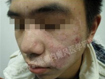 诊断:5个月前,脸部出发现指甲大小的白点,瘙痒。曾服用药复方甘草酸甘片,桃红清血片。外用:白癜净、白消灵效果不佳来我院治疗