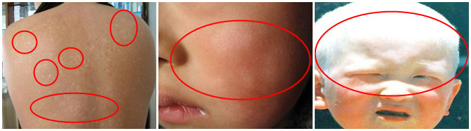 2、贫血痣亦为在小的时候发病,发病部位多在面、颈、躯干或其她部位。四周无色素加深现象。拍击磨擦部分部位,淡色斑本身不发红,而四周皮肤发红。