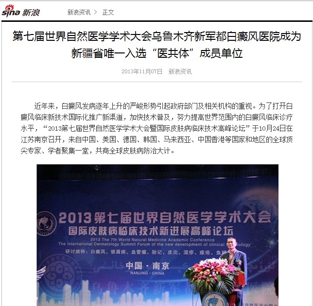 近年来,白癜风发病逐年上升的严峻形势引起政府部门及相关机构的重视。为了打开白癜风临床新技术国际化推广新渠道,加快技术普及,努力提高世界范围内的白癜风临床诊疗水平,“2013第七届世界自然医学学术大会暨国际皮肤病临床技术高峰论坛”于10月24日在江苏南京召开,来自中国、美国、德国、韩国、马来西亚、中国香港等国家和地区的全球顶尖专家、学者聚集一堂,共商全球皮肤病防治大计。