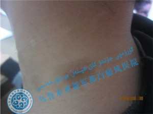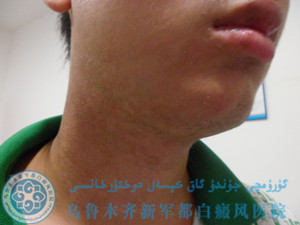 ▲现病史:患者2月前发现颈部白斑,曾在其他医院治疗过,用药后白斑无明显疗效,并呈进行性扩散加重。遂来我院就诊。