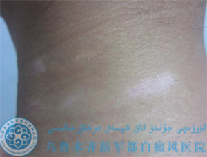 【治疗前,颈部白癜风边界模糊,属于发展期白癜风】