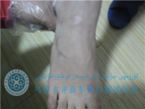 ▲病史: 一年前发现脚背出现小白斑,渐渐扩展成片状,曾使用过外用药,后白斑有所扩散,在当地某医院就诊,诊为“白癜风”,给予外用药和口服药,均不见好转。后来我院就诊。