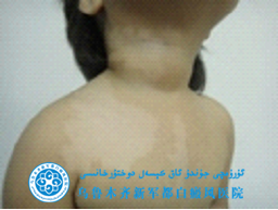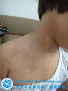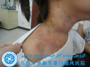 ▲病史: 一年前,患儿家长发现胸部有白点,药物涂抹治疗,无效后去当地某医院检查治疗,确诊为白癜风,接受服药治疗,病情扩散。后来我院接受治疗。